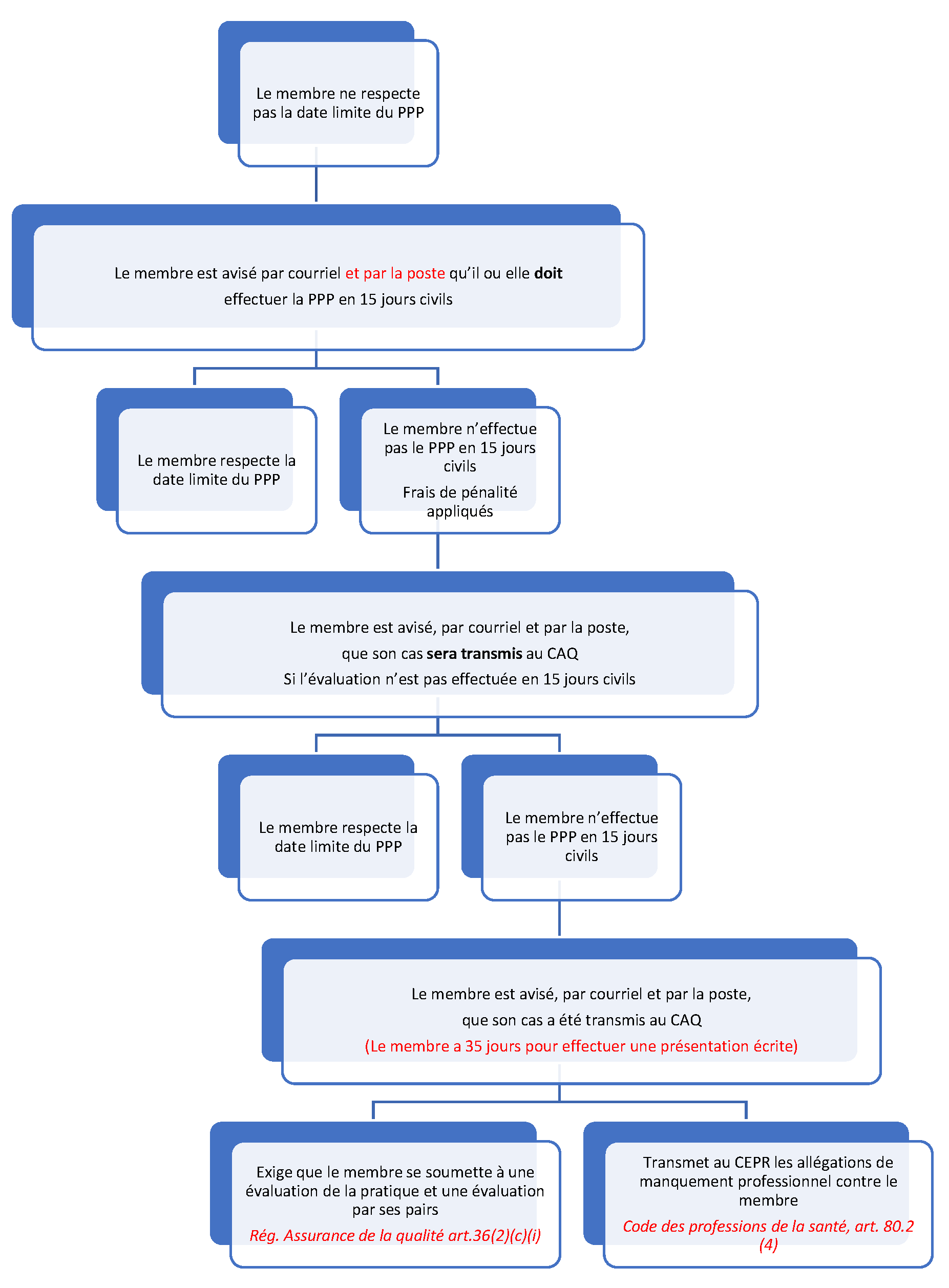 membre de l’OTRO ne remplit pas son obligation de PPP dans les délais rescrits, on lui envoie un avis de rappel. S’il ne remplit pas son obligation dans un délai de 15 jours de la date d’envoi de l’avis de rappel, il se verra facturer des frais de retard de 25 $, tel qu’il est décrit dans le barème de frais de l’OTRO. Si le membre n’envoie pas l’évaluation du PPP malgré les avis répétés (voir l’annexe A – Résumé des exigences – PPP non conforme ou présenté en retard), un sous-comité du Comité d’assurance de la qualité peut prendre une ou plusieurs des mesures suivantes :
