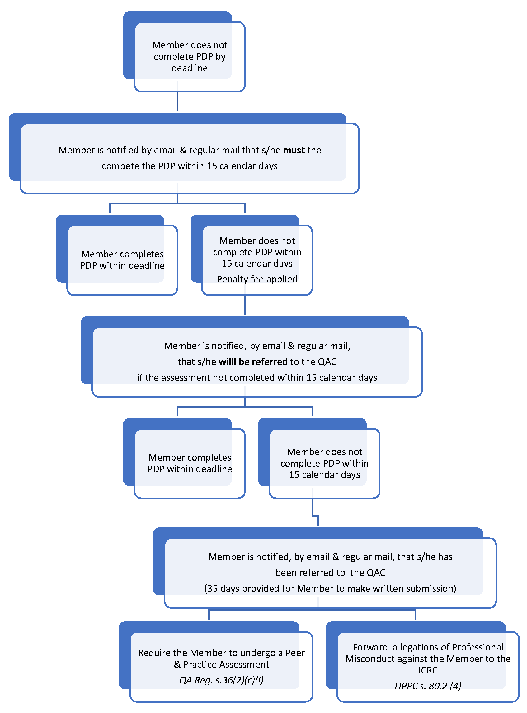 The CRTO establishes timelines for completion of all PDP components, criteria for successful completion and monitors participation of CRTO Members in the PDP on an ongoing basis. If a CRTO Member does not complete their PDP requirements by the established deadline, they will be sent a reminder notice. If they do not complete their obligation within 15 days of the sent date of the reminder notice, they will be charged a penalty fee of $25 as outlined in the CRTO Schedule of Fees. If the Member does not submit the required PDP evaluation despite repeated notification (See Summary of Non-Compliance and Late Submission of PDP Requirements in Appendix A), a panel of the QA Committee may do any one or more of the following: