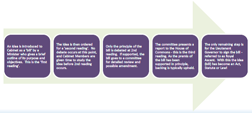 A lot went into the development of RT self-regulation and the creation of the CRTO before 1994 – starting with an idea within the provincial government. In Ontario, ideas become laws through the process below: